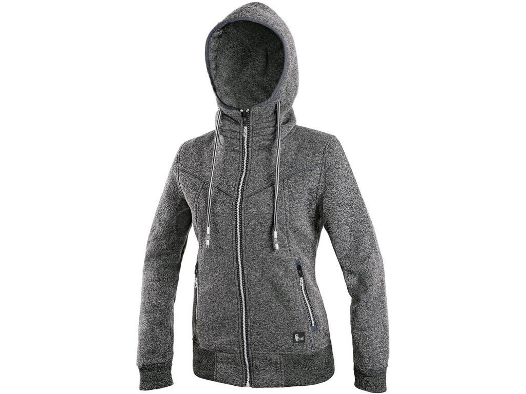 Dámská bunda z pleteniny, kapuce napevno, zapínaní na zip, pas a rukávy ukončeny pružnou manžetou, reflexní doplňky, 2 boční kapsy.