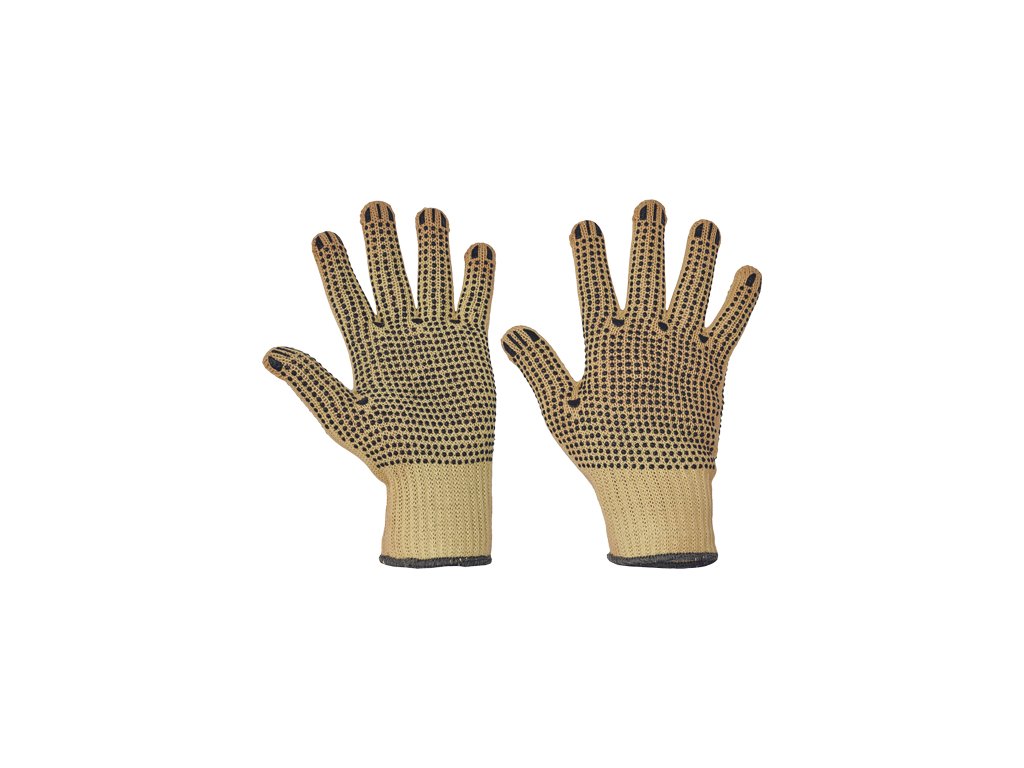 • pletené bezšvíkové obojručné rukavice zo stredne silného kevlarového úpletu • PVC terčíky v dlani, na chrbte a prstoch