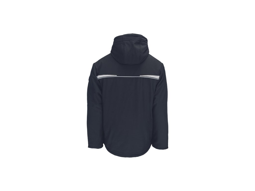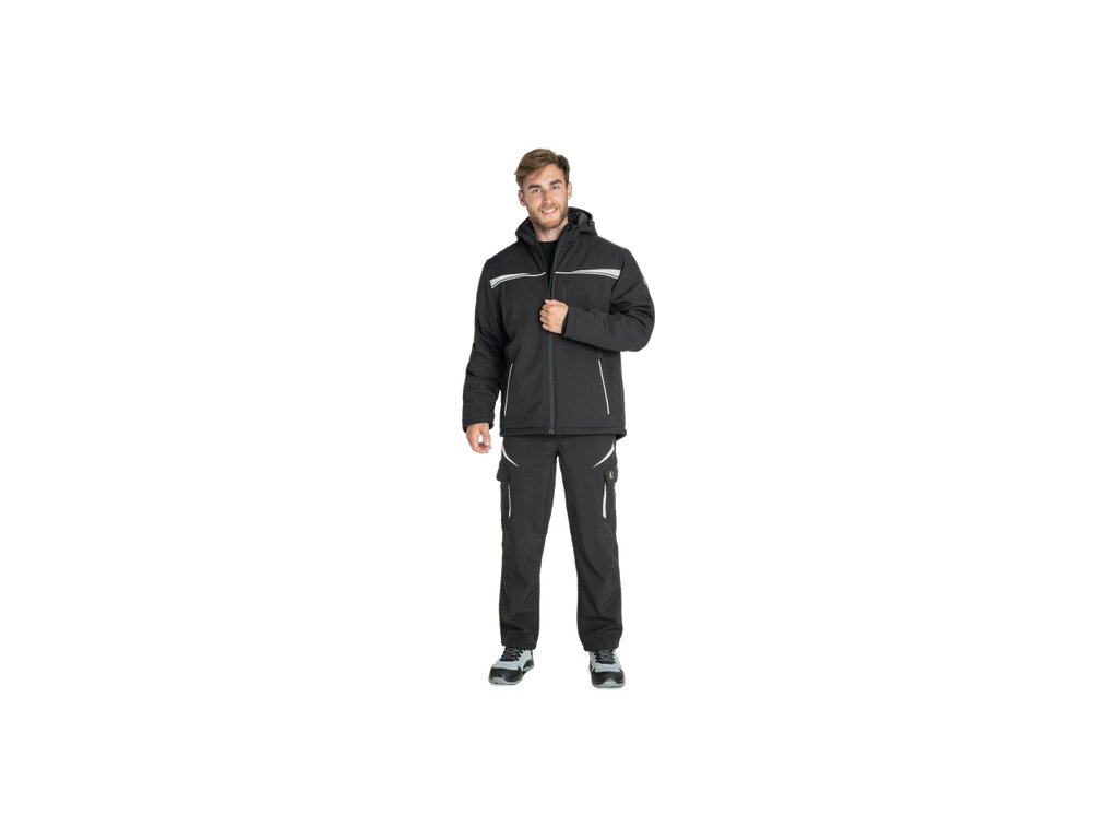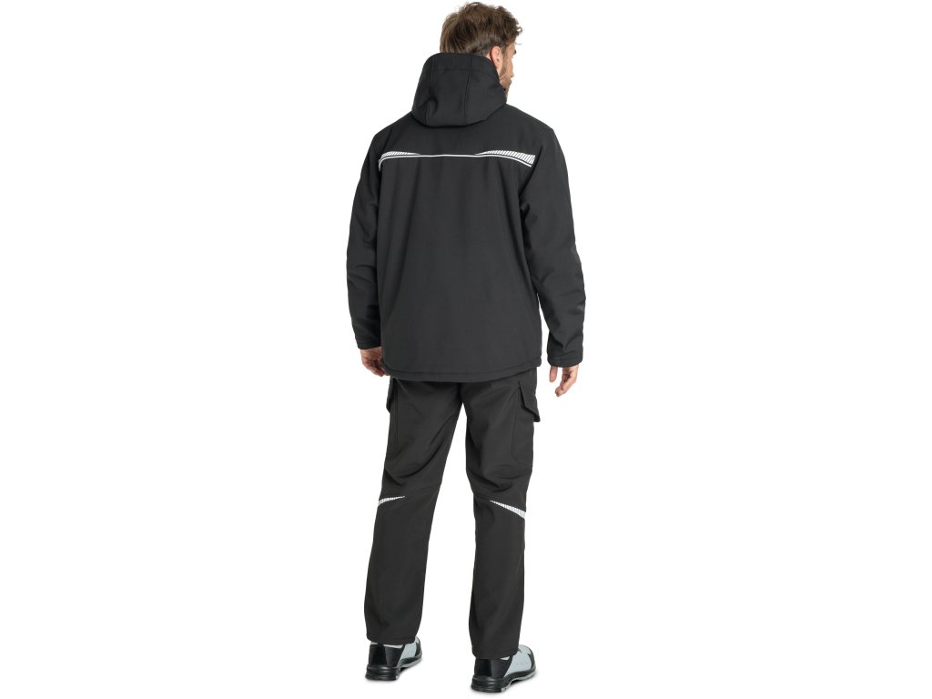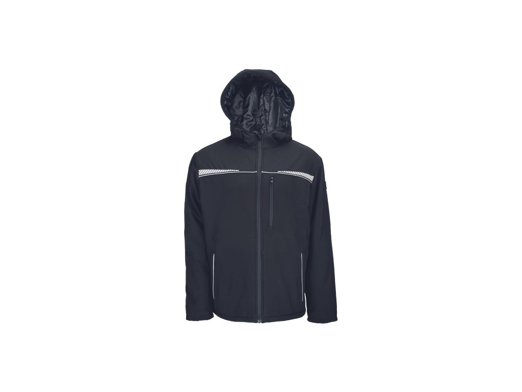 • zimná softshellová bunda s kapucňou a zapínaním na zips • dve bočné vrecká na zips • jedno ľavé náprsné vrecko na zips • jedno vnútorné náprsné vrecko • elastické manžety na rukávoch • vetranie v podpazuší na zips • reflexné detaily a lemovanie