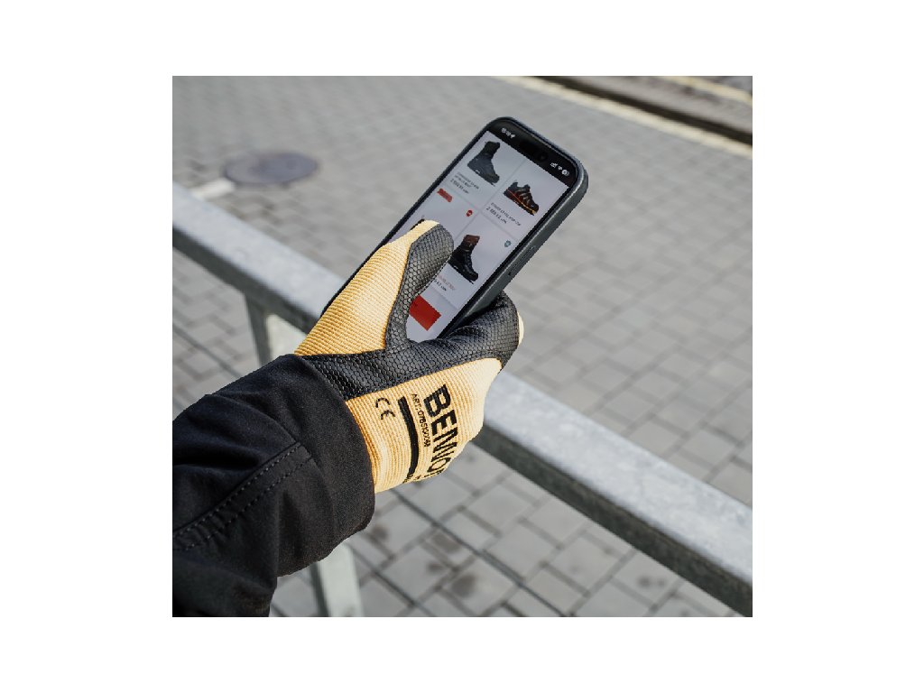 V oblasti konců prstů je z vrchní strany materiálové zpevnění, jež chrání tuto citlivou část rukou před mechanickým poškozením. Spodní část prstů má materiálovou strukturu, jež umožňuje pohodlné a přesné ovládání dotykového mobilního telefonu.