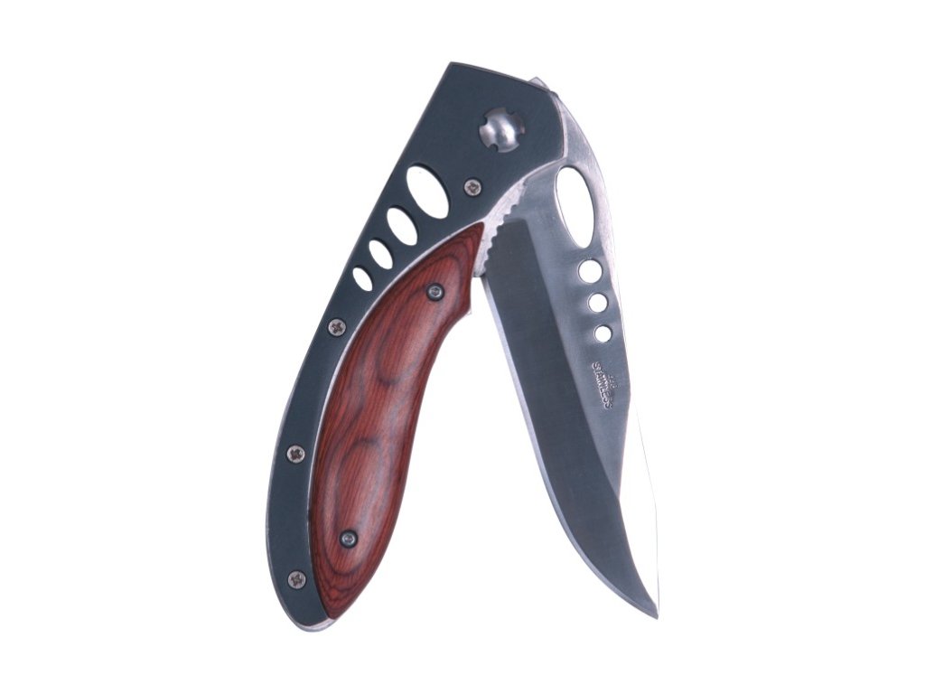 Čepel vyrobena z kvalitní oceli 420 s bezpečnostní pojistkou, dřevěná