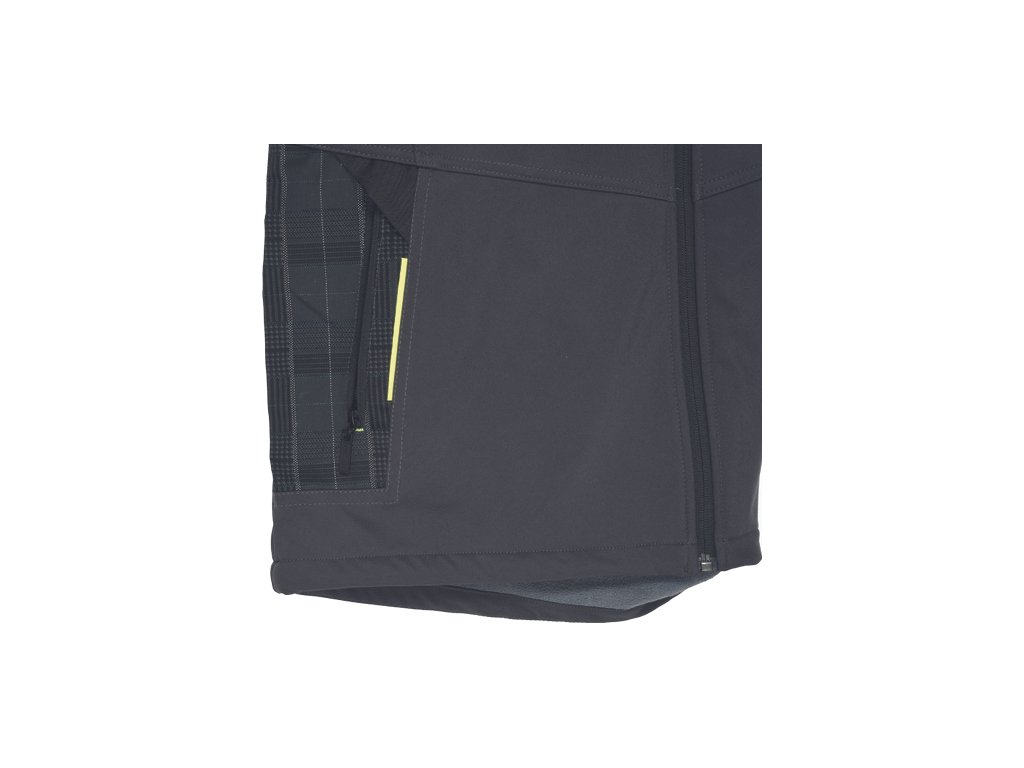 • softshellová bunda pohodlného strihu • kárované a signálne žlté doplnky • TPU membrána • vnútorné zateplenie fleecom • vodeodolné zipsy • zosilnenie v oblasti lakťov