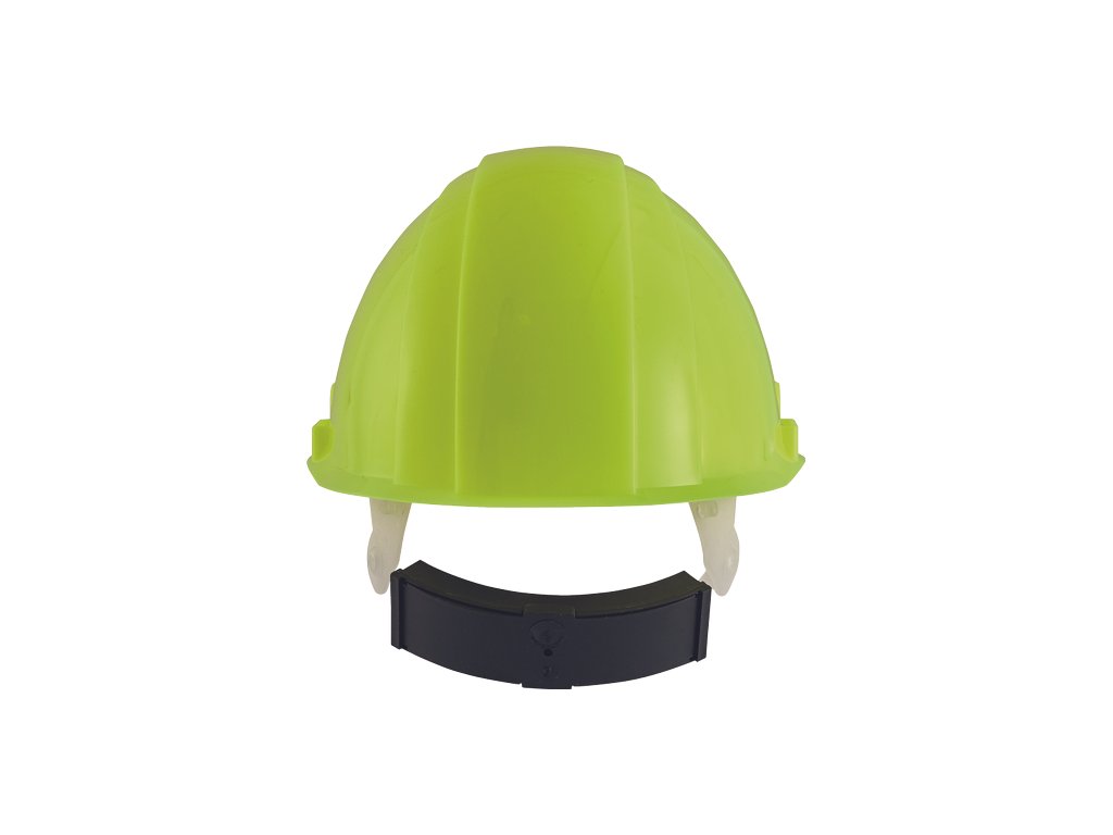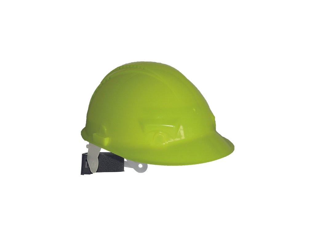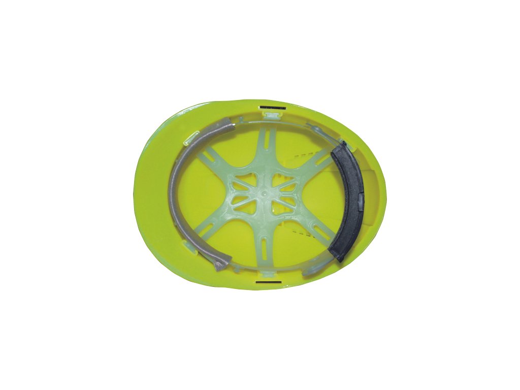 Přilba z HDPE s ventilací, 6-ti bodovým náhlavním křížem a automaticky nastavitelnou velikostí (53-62 cm) v Hi-vis barvě.
