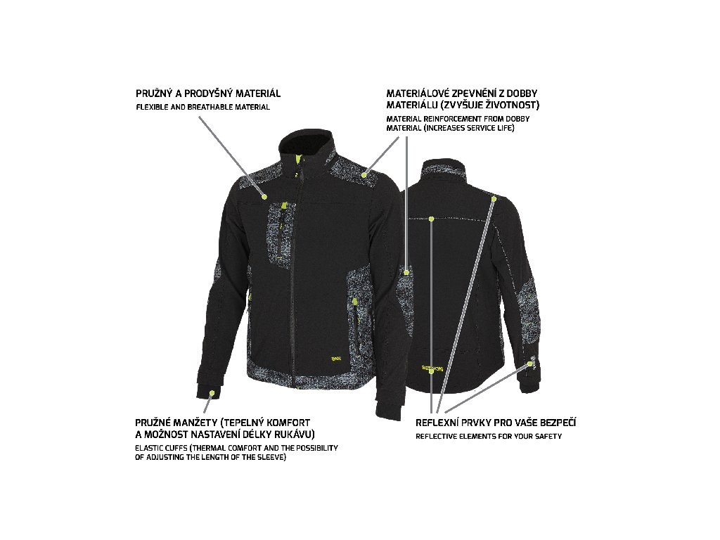 • materiálové zpevnění z odolného DOBBY materiálu v namáhané části ramen, loktů a kapes zvyšuje životnost bundy