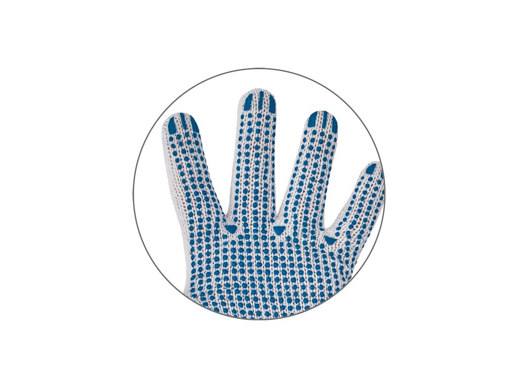 • pletené bezšvové obojstranné rukavice zo zmesi polyester/bavlna • s PVC terčíkmi a pružným nápletom na zápästí