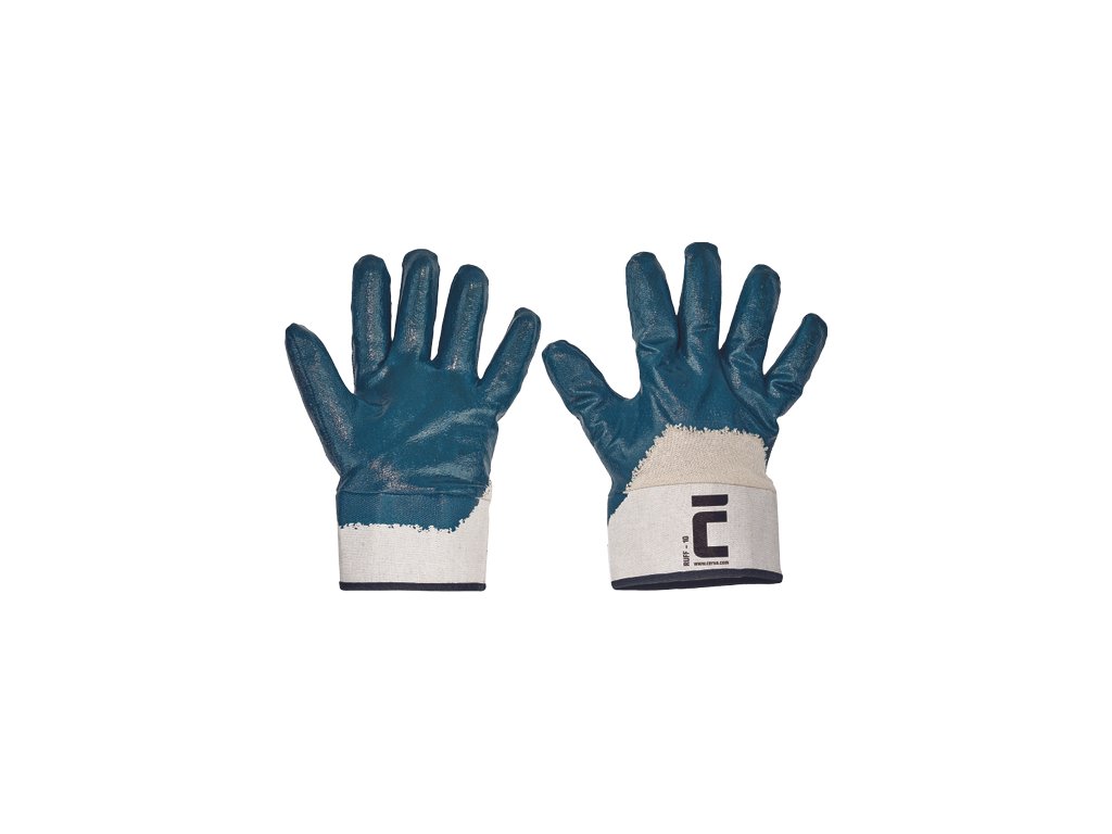 • rukavice šité z bavlneného úpletu • polomáčané v nitrile • pevná manžeta