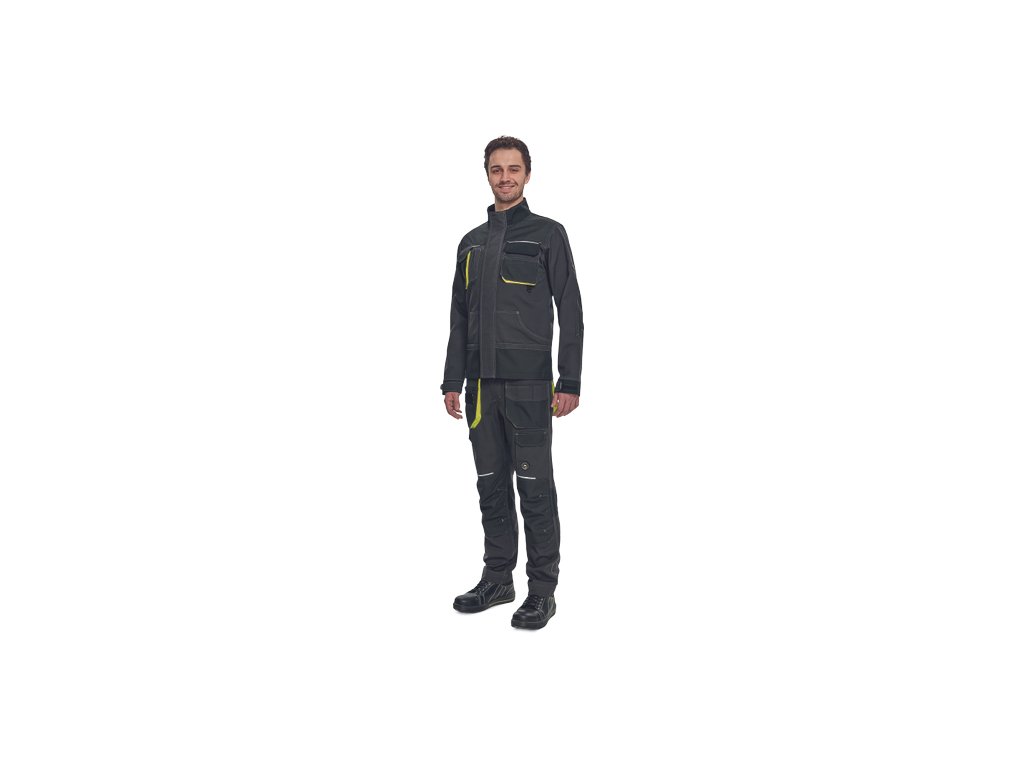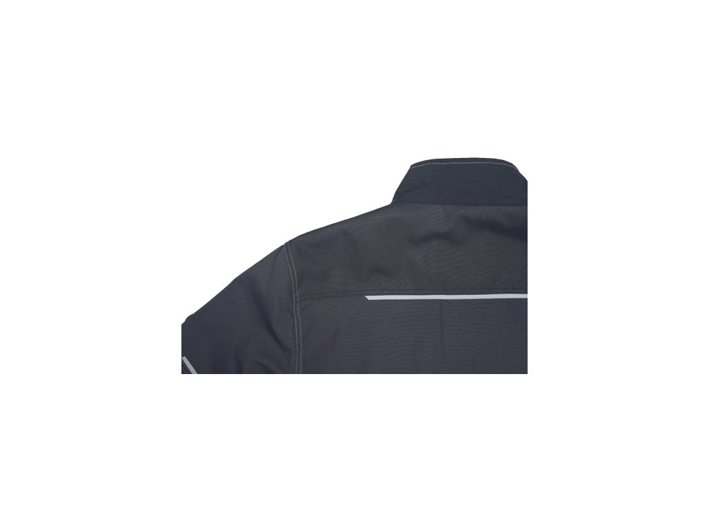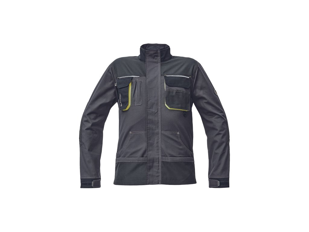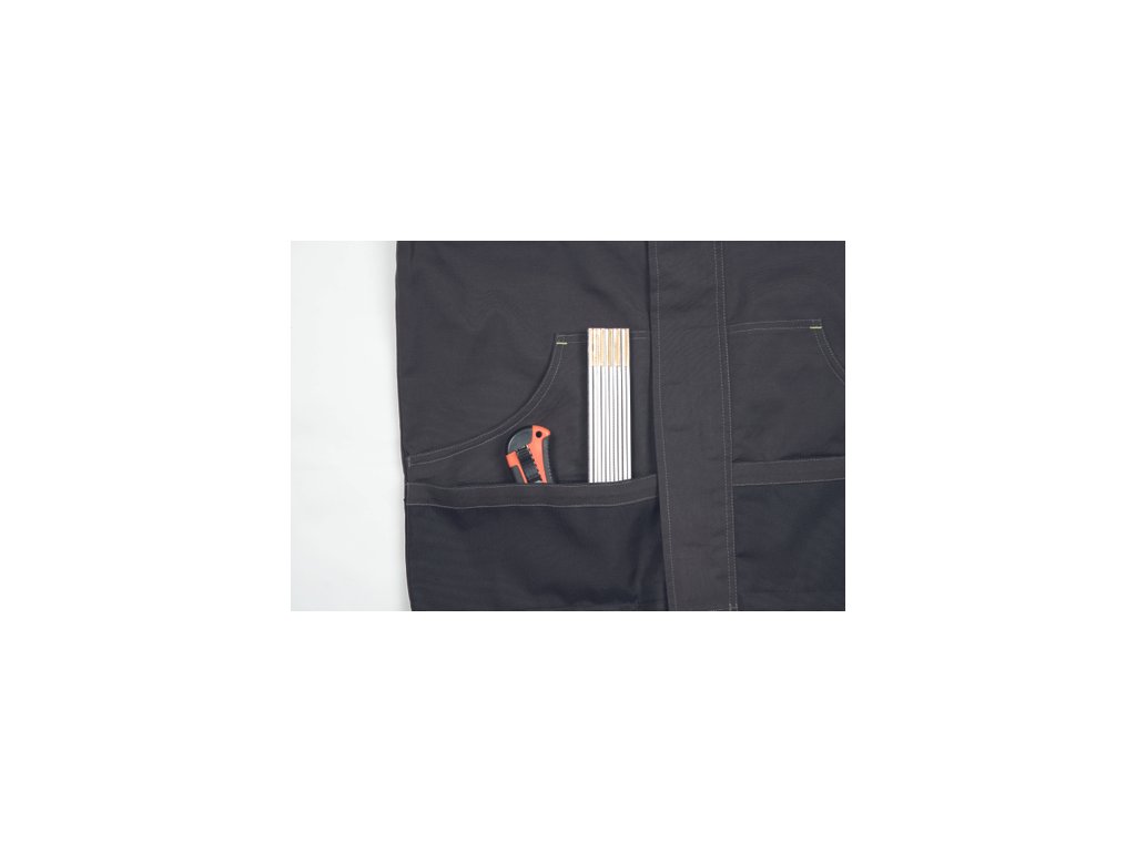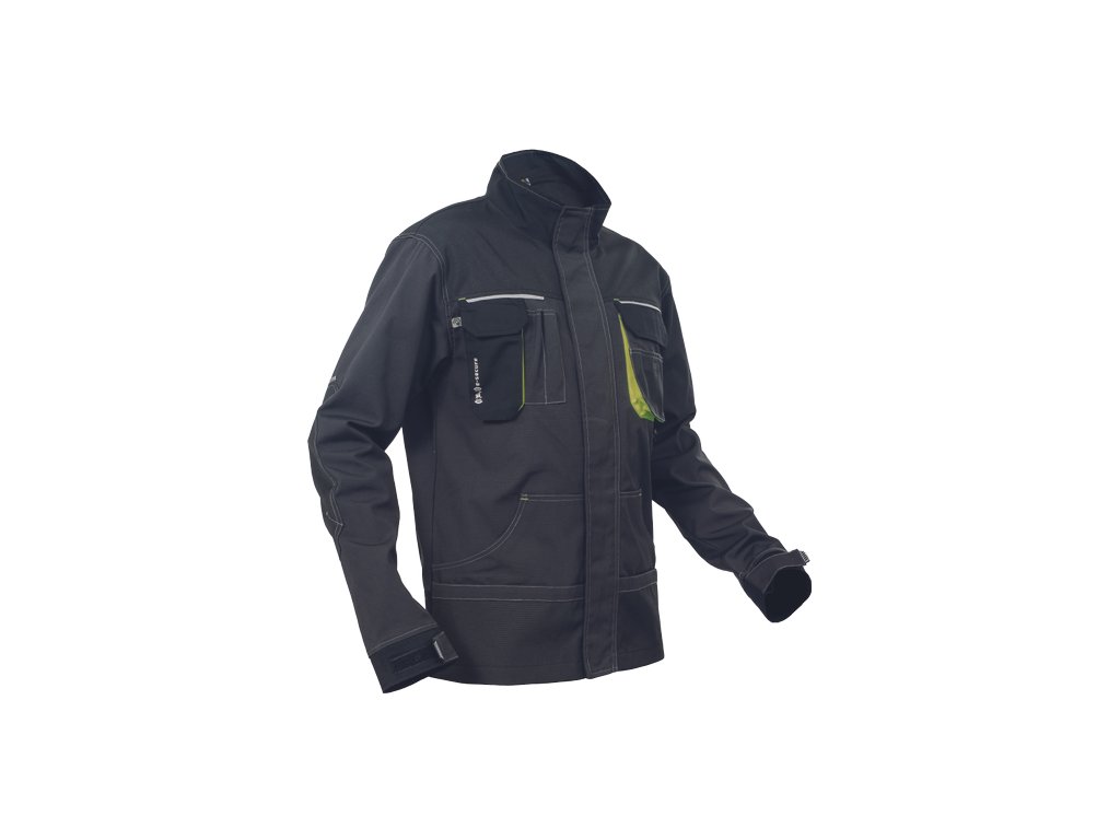 • pánska pracovná bunda, zapínanie kryté légou na suchý zips • 2 predné vrecká • 2 náprsné vrecká • 1 náprsné vrecko na mobilný telefón • Oxford 600D zosilnenie lakťov • reflexné prvky • kontrastné prešitie