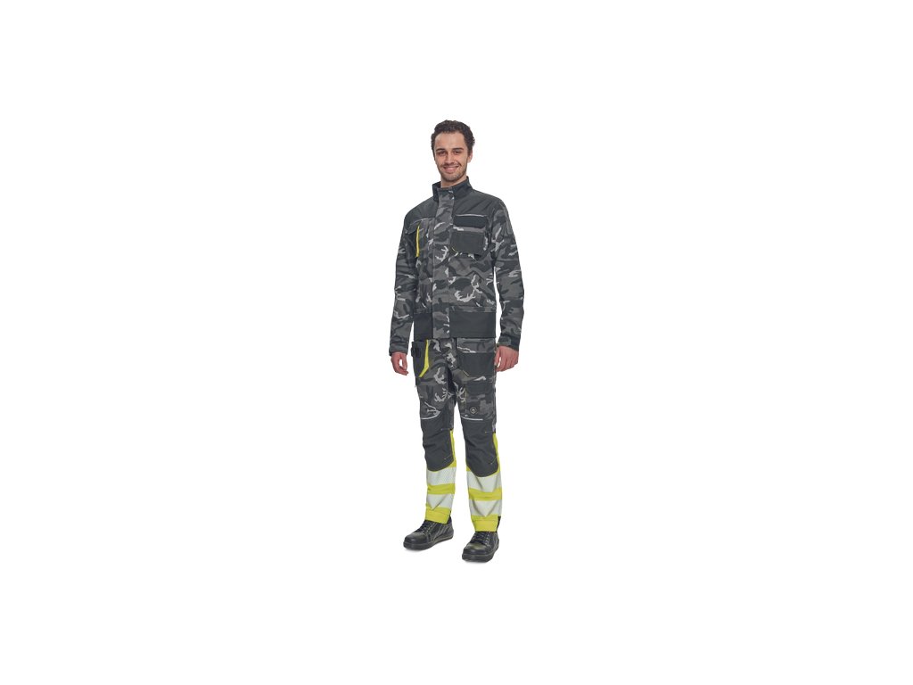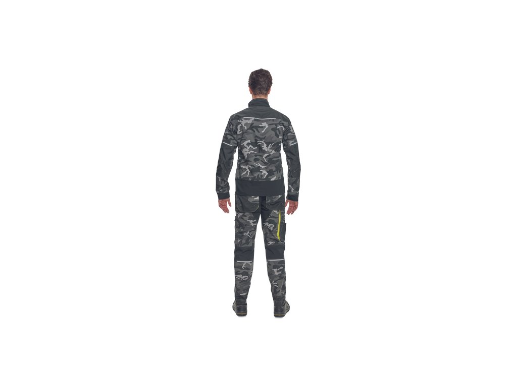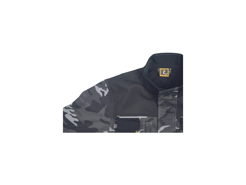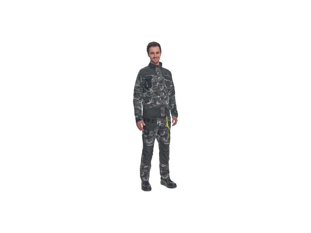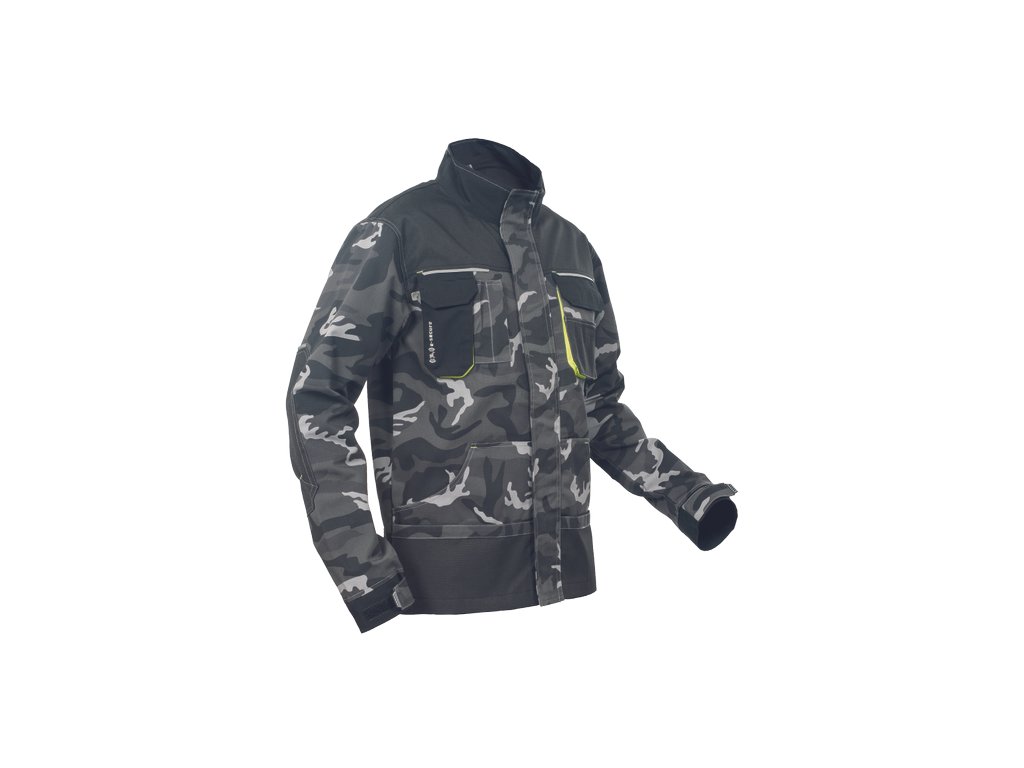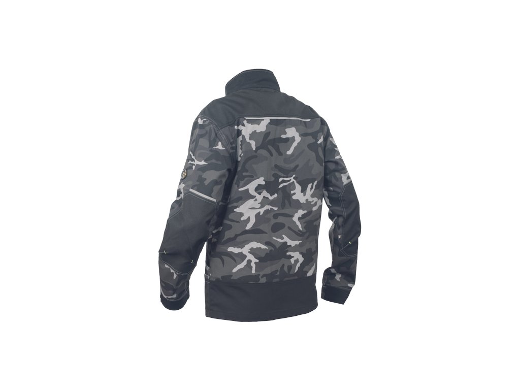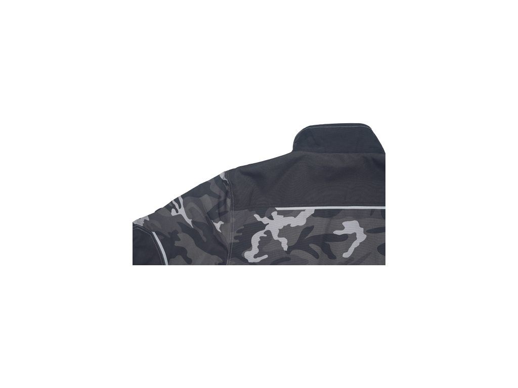 • pánska pracovná bunda • zapínanie kryté légou na suchý zips • v modernej úprave šedej kamuflážovej farby • 2 predné vrecká • 2 náprsní vrecká • 1 náprsné vrecko na mobilný telefón • Oxford 600D zosilnenia lakťov • reflexné prvky • kontrastné prošitie