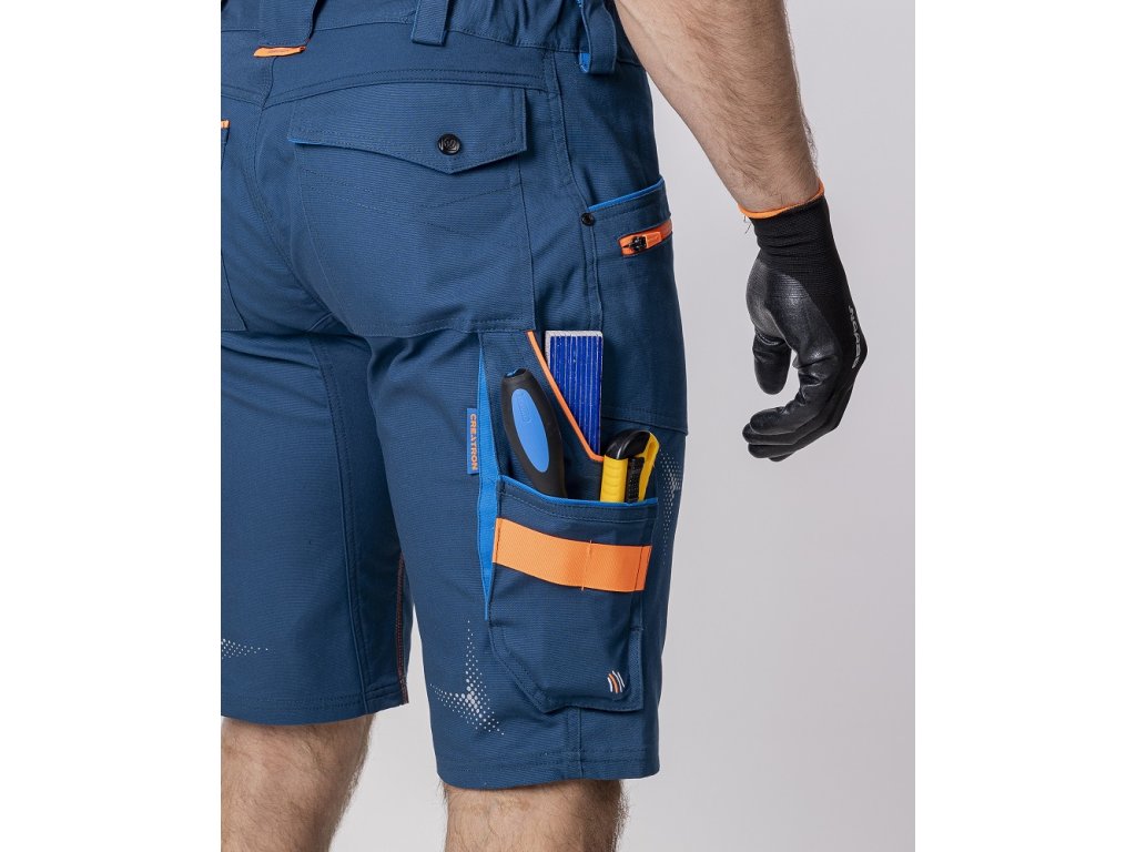 • kraťasy sú vybavené pružným pásovým golierom spolu so skrytým zadným dvojitým pútkom pre pohodlné usadenie opasku, vnútornou protišmykovou páskou, D krúžkom na karabínu, 2 priehmatovými vreckami, 1 predným zipsovým vreckom, 1 predným náraďovým vreckom so širokým pútkom