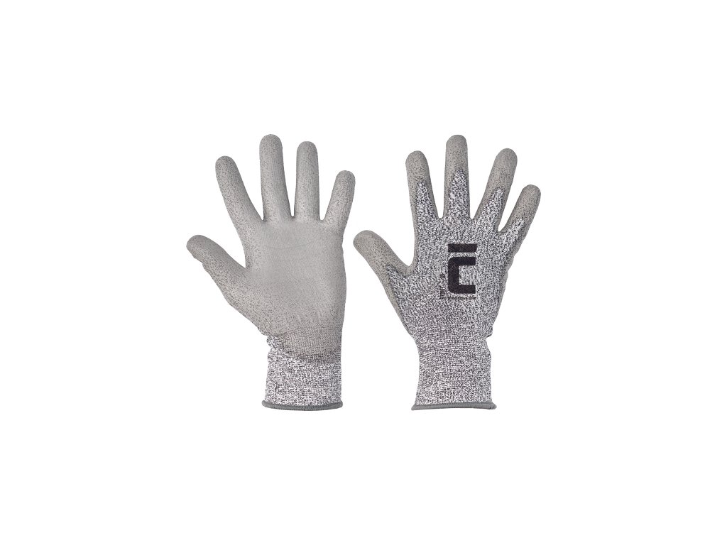 • pletené bezšvové rukavice • kategórie prerezu B • sivý PU na dlani a prstoch