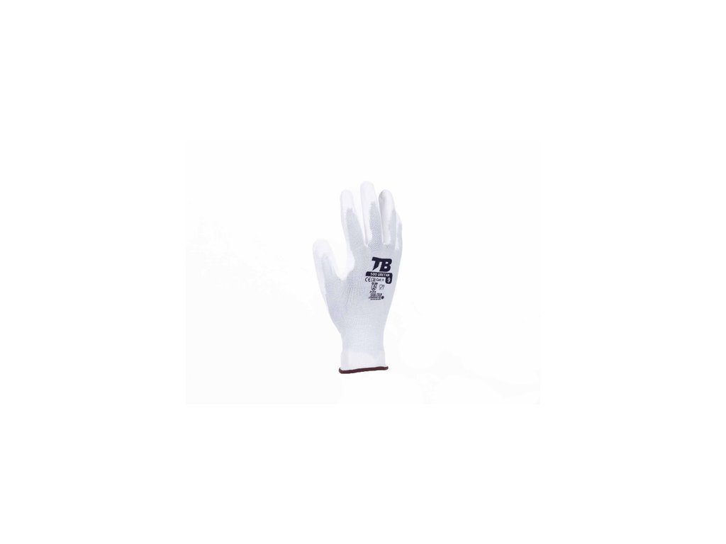 • biela bezšvová nylonová rukavice máčaná v PU na dlani a prstoch • špeciálny PU máčaný, na ktorom sa nedržia nálepky (ideálne napríklad do skladov) • pletená manžeta • hustota úpletu 13 GG