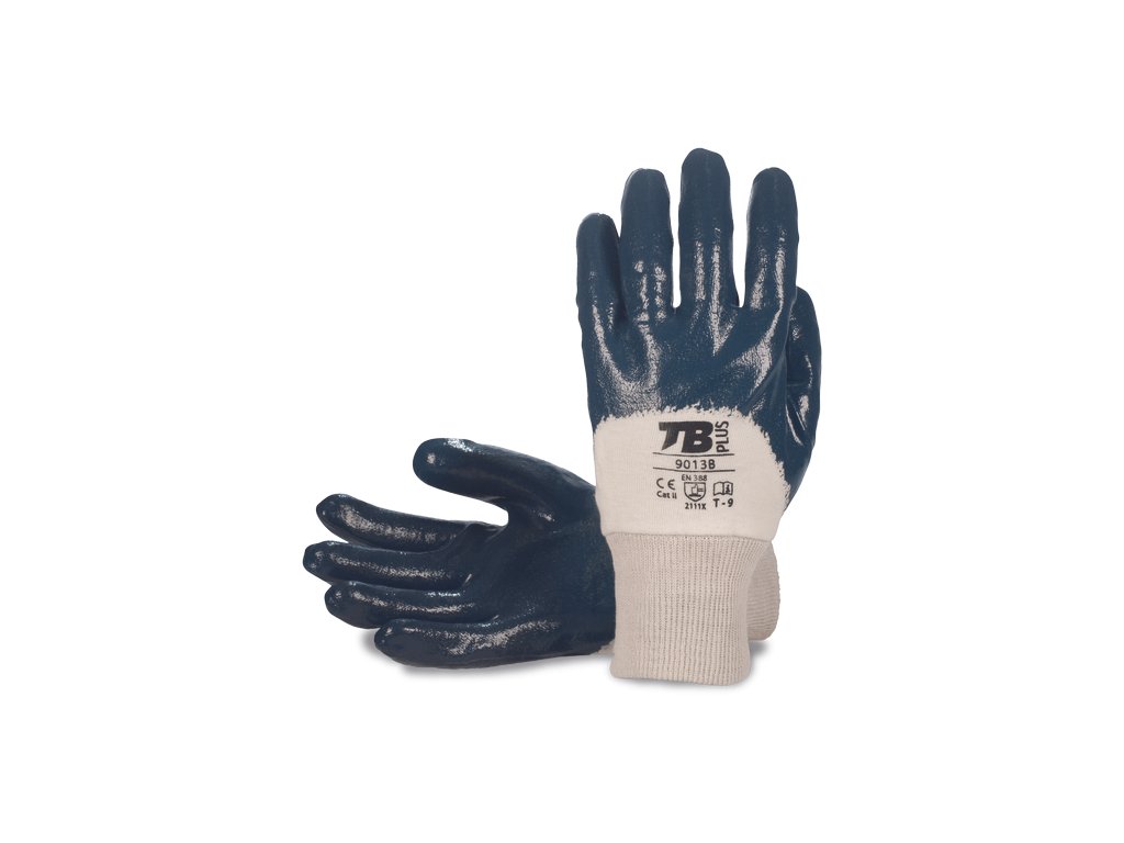 • rukavice s bavlnenou podšívkou, 3/4 modrej nitrilovej omáčky, pletená manžeta • dobrá odolnosť voči olejom, mazivám a olejovým vedľajším produktom • elastická manžeta a ľahký základ rukavíc absorbujúci vlhkosť