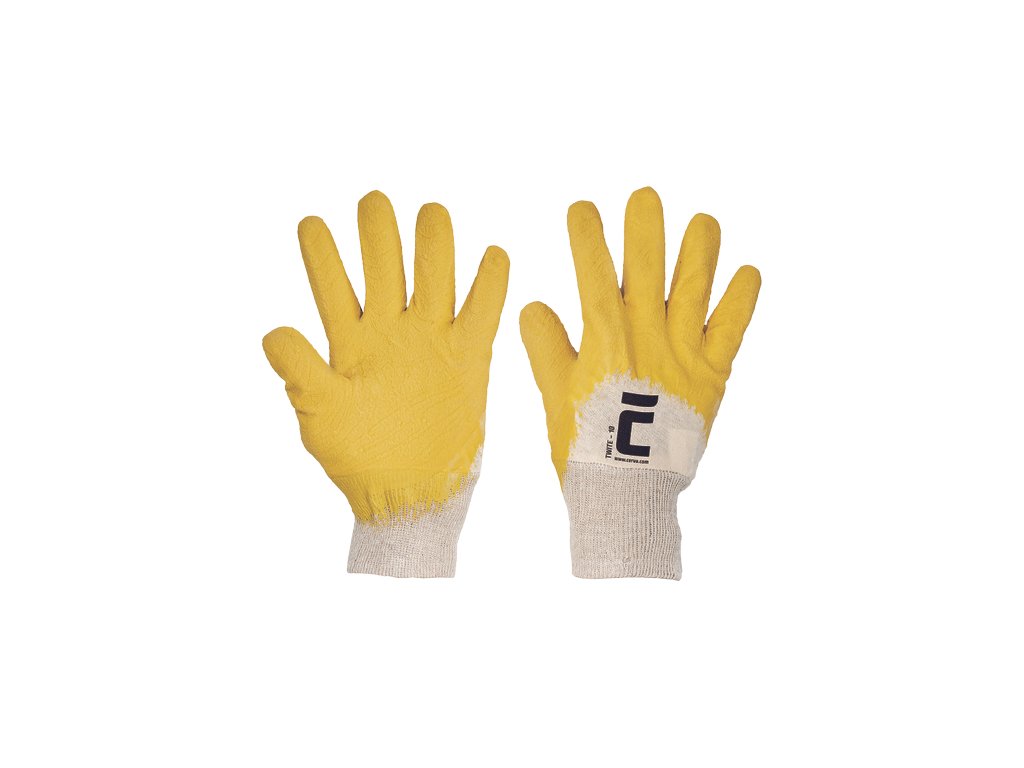 • žlté rukavice šité z bavlny • polomáčané v prírodnom latexe • s protišmykovou úpravou v dlani a na prstoch